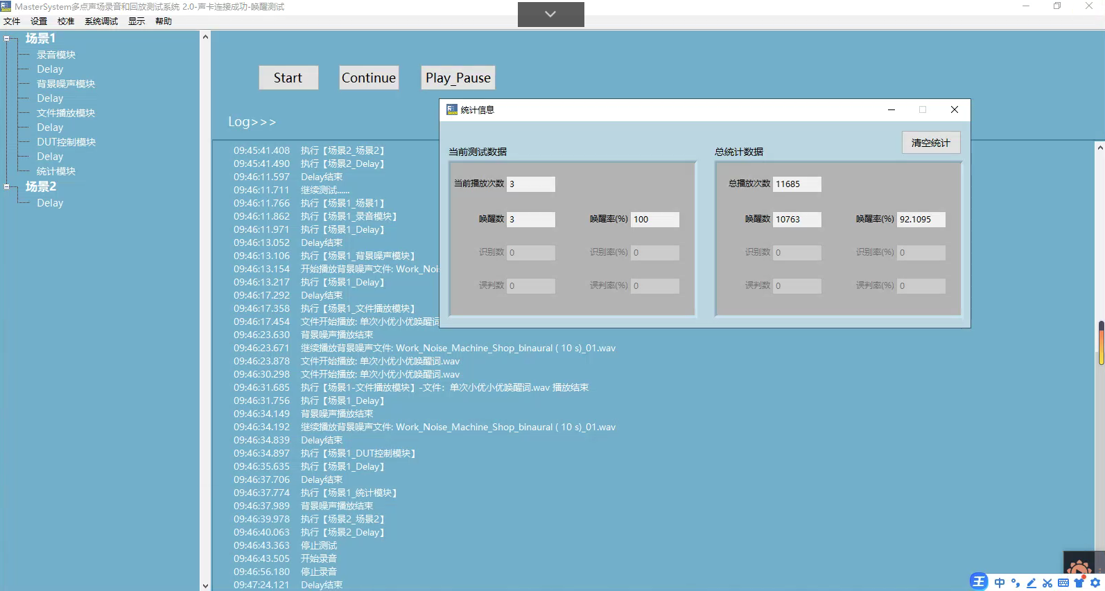 MasterSystem支持串口、ADB、网口、脚本等通讯接口用于调用第三方硬件。如下图是按序列播放各种噪音的情况下,同时播放唤醒词,压测某款智能音响的唤醒率测试截图。