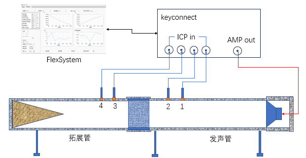 扬声器发出的平面声波在测试样本处发生反射与穿透,在发声管与拓展管中产生复杂的驻波。在发声管靠近样本的两个位置1和2上测量声压,求得12两个传声器信号间的传递函数;在拓展管中靠近样本的两个位置3和4上测量声压,求得两个34两个传声器信号间的传递函数,由传递矩阵法计算试件的法向入射透射系数、传声损失等相关声学量。