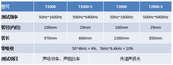 T1000系列包含T1000/T1000-S,T2000/T2000-S:T1000/T1000-S是基于双传声器传递函数法开发的阻抗管,其中T1000是内径100mm的大管,T1000-S是内径29mm的小管;T2000/T2000-S是基于四传声器传递函数法开发的隔声测试阻抗管,其中T2000是内径100mm的大管,T2000-S是内径29mm的小管。